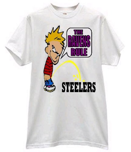 T SHIRT THAT SHOWS BOY SAYING THE RAVENS RULE WHILE PEEING ON THE STEELERS. IF YOU WANT TO SUBSTITUTE A DIFFERENT TEAM GETTING PEED ON EMAIL ME SO I CAN CHANGE IT FOR YOU.
