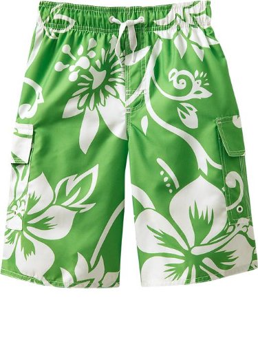 Old Navy Elasticized waistband with drawstring; faux fly Contrasting striped side seams All over hibiscus print Secure close cargo pockets with draining grommets at leg Smooth, quick drying shell with built in mesh brief Contrast topstitching Sits just below waist Relaxed through hip and thigh Approximately 8 1/2 inseam UPF 50 for excellent UV protection accords with ASTM Standard D 6603